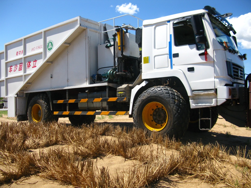 在產(chǎn)品的開發(fā)方面,公司前期展開的項目是同北京林業(yè)大學合作開發(fā)的沙漠鋪草機,其方案及詳細圖樣基本確定,將在北京林業(yè)大學研究團隊所取得的“多功能立體固沙車”(見下圖)國家林業(yè)局科技成果上做進一步的改進,審核組專家對應也給了相關(guān)意見,并表示目前治沙設(shè)備在國內(nèi)外均為空白,市場前景廣闊?!岸喙δ芰Ⅲw固沙車”,集固沙、噴播、插條為一身,通過課題研究獲得了該類型產(chǎn)品的重要核心技術(shù),形成擁有自主知識產(chǎn)權(quán)的“多功能立體固沙車” 系列產(chǎn)品;該類技術(shù)與產(chǎn)品將對林業(yè)產(chǎn)業(yè)技術(shù)進步,提升林業(yè)機械制造業(yè)的核心競爭力,提高林農(nóng)相關(guān)產(chǎn)業(yè)、沙產(chǎn)業(yè)的發(fā)展,起到支撐和推動的作用。 研究團隊所取得的“多功能立體固沙車”科技成果,在東北的海拉爾沙地推廣示范工程收到良好的效益。
